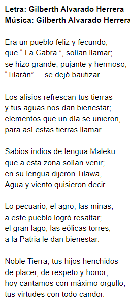 Himno del cantón de Tilarán
